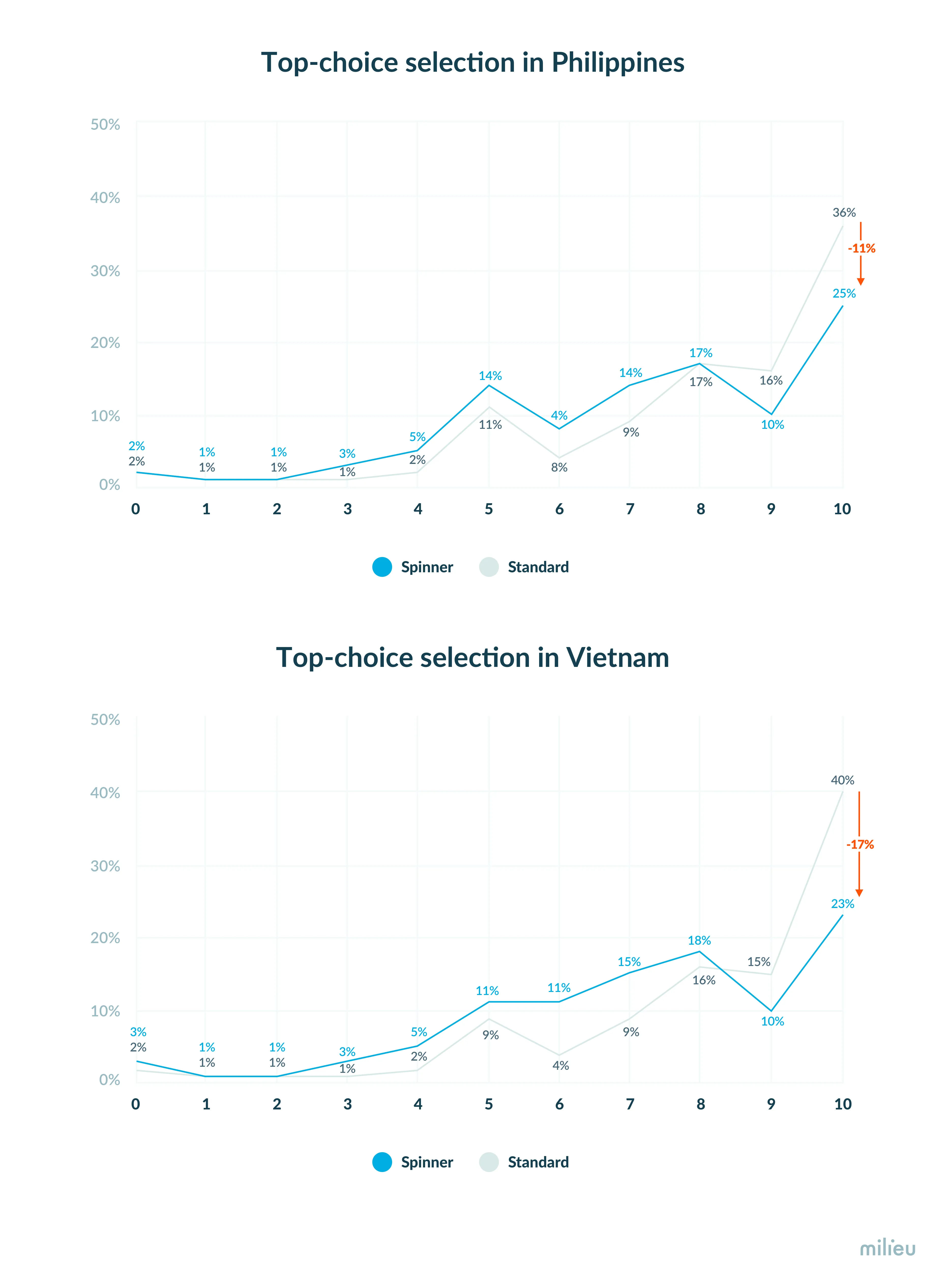 For a 11-point scale (which is commonly used in NPS ratings), Vietnam is approximately twice as likely to pick the top-box on a standard scale relative to the spinner scale (40% on a standard scale vs 23% on a spinner scale).