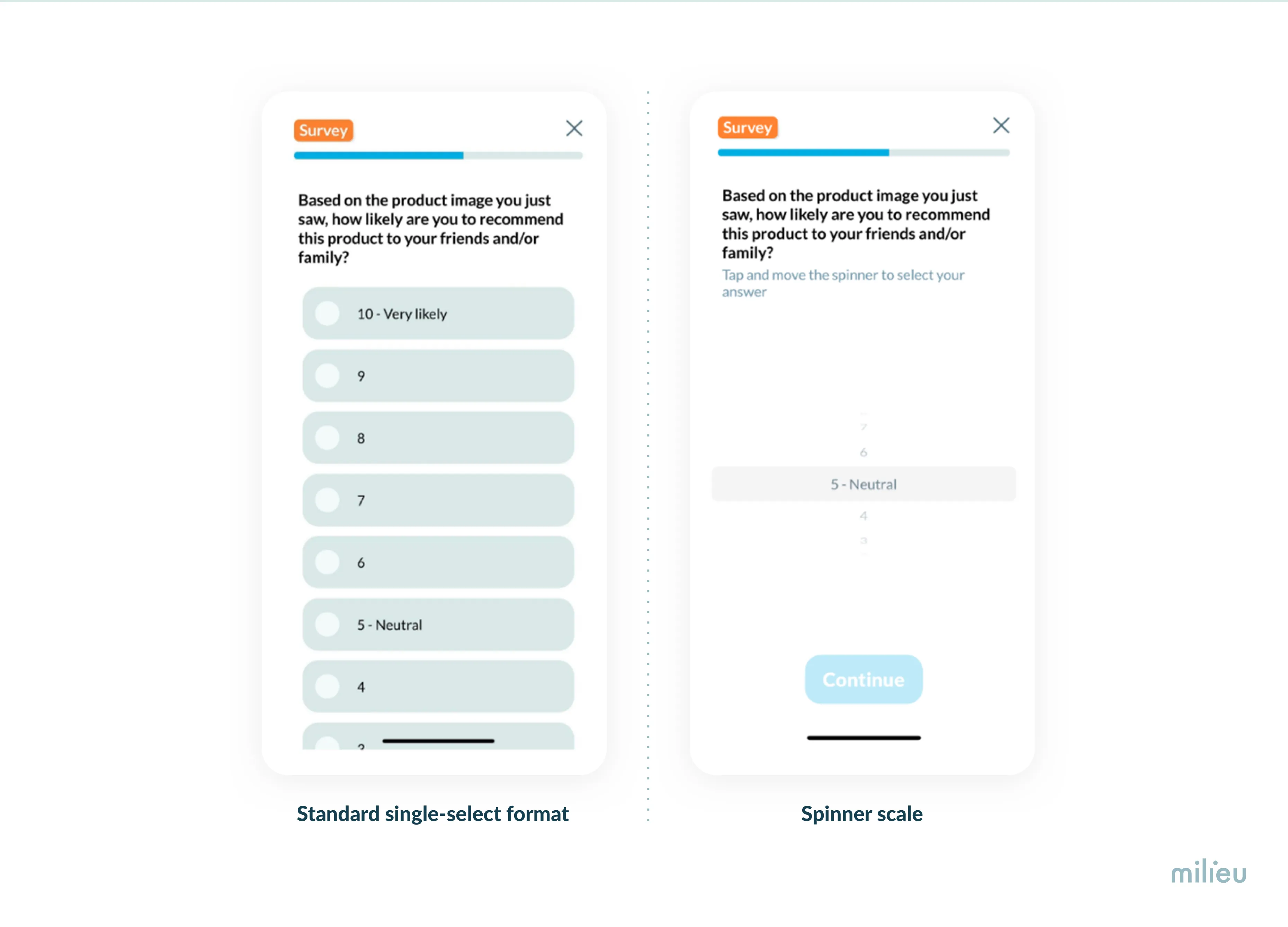 Some other platforms find that using a visual format for rating scales can reduce inter-country variance by almost a third. Visual formats often work well on desktop screens, however they translate to a poor user experience when used on a smartphone screen. Avoid the standard single-select format for long response scales and explore alternative rating scale formats to see what suits your research methodology and needs the best. What’s important to consider is that smartphone screens have limited real-estate. Scales that can be optimised for it will yield better results.