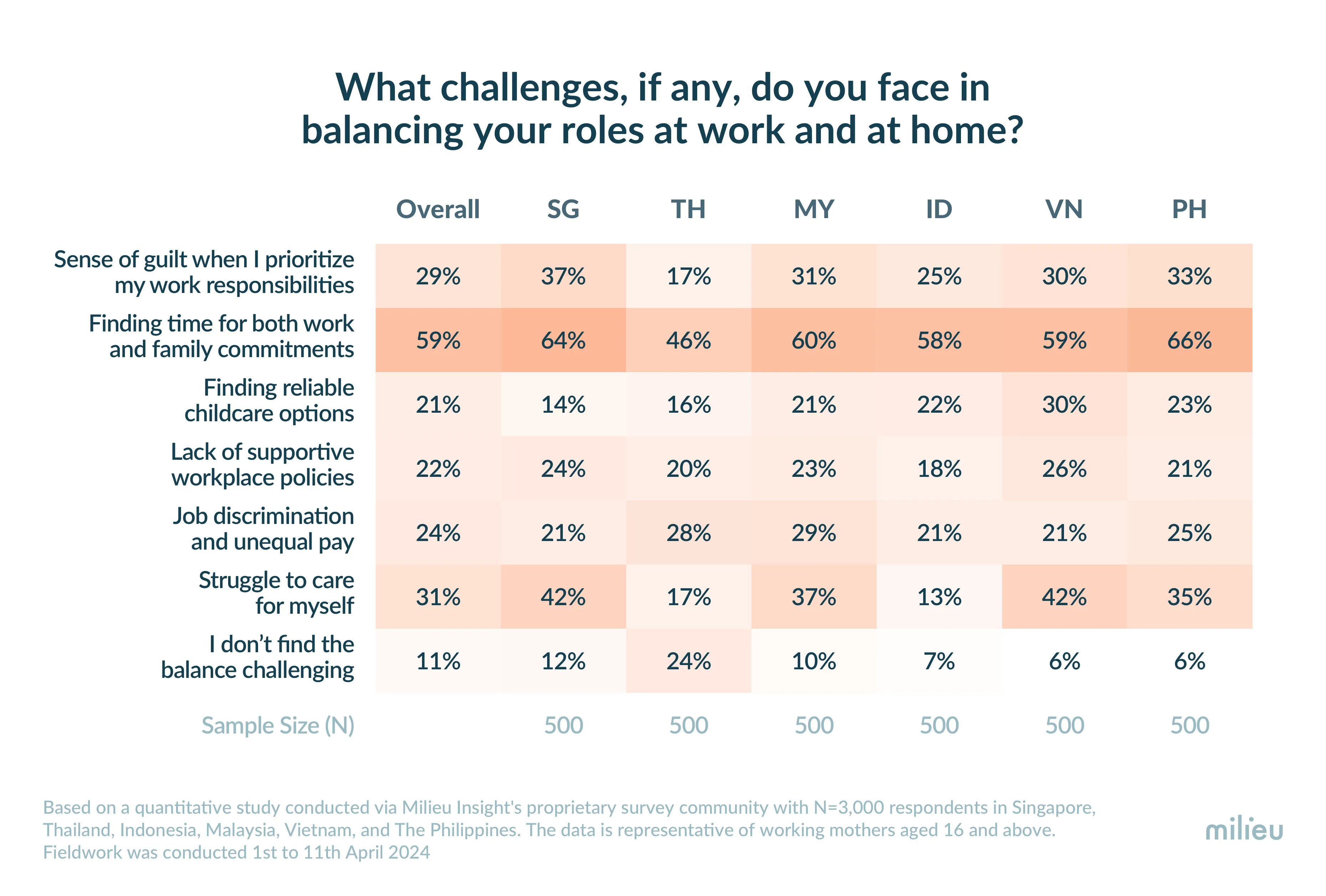 The quantitative study, conducted by Milieu Insight’s proprietary survey community, polled 3,000 working mothers across Southeast Asia covering Singapore, Malaysia, Indonesia, Vietnam, The Philippines, and Thailand. “While women have contributed to Southeast Asia’s growth, their share of managerial positions remains below parity. Our study highlights the pressing challenges faced by working Southeast Asian women today, including the delicate balance between work and family commitments, self-care amidst hectic schedules, and the burden of guilt when prioritizing professional responsibilities. However, amidst these obstacles, it's heartening to know that working mothers in Asia employ various strategies to navigate the complexities of their personal and professional lives. As we celebrate the pivotal role of mothers in our society this Mother's Day, let us acknowledge and address their strength and sacrifices,” said Juda Kanaprach, Co-Founder and CCO, Milieu Insight.