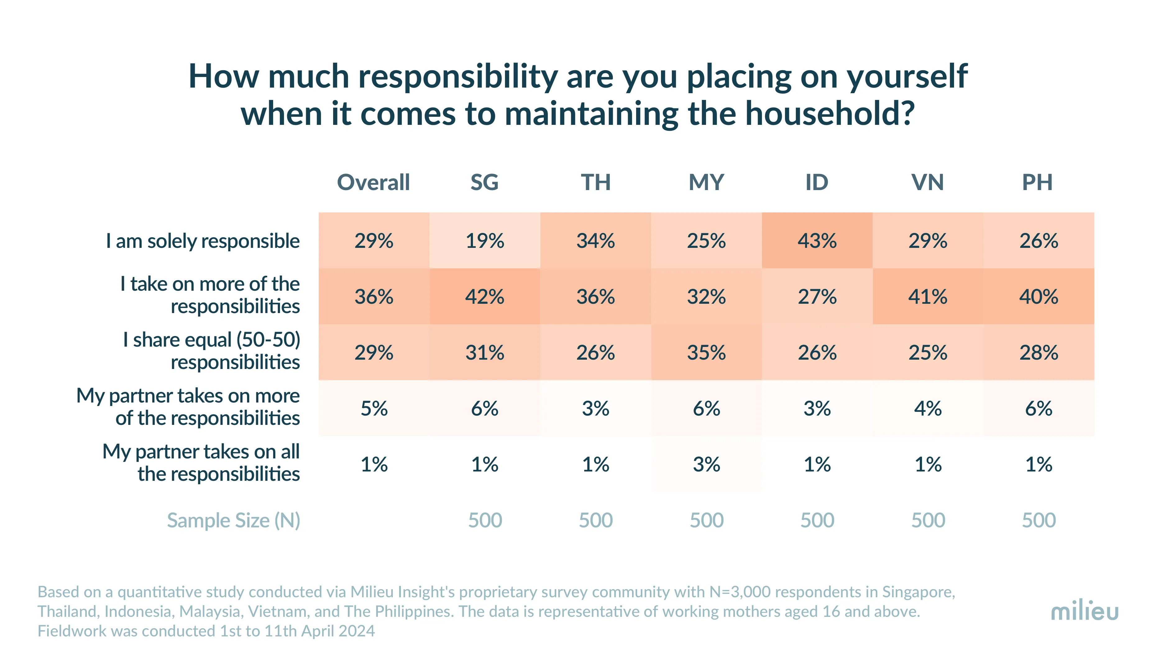 Milieu Insight's research suggests that with inclusivity, flexibility, and support, workplaces can create a nurturing environment where women could excel in their professional roles while fulfilling their duties as mothers. This study, conducted via Milieu Insight's proprietary survey community, offers a comprehensive understanding of Southeast Asian women at work, highlighting key insights and behaviors. Fieldwork was carried out from 2nd to 12th April 2024.