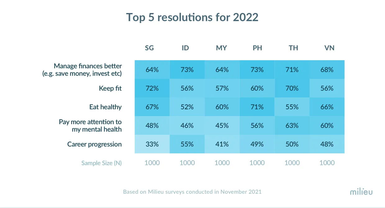 Among a list of 15 resolutions, keeping fit emerged among the top 3 resolutions in each country. For Singaporeans in particular, keeping fit emerged as the top resolution for 2022.