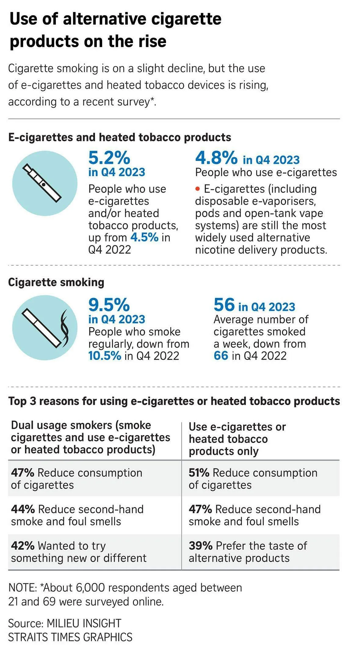 The online survey of 6,000 Singapore citizens and permanent residents, aged between 21 and 69, found that alternative products like e-cigarettes were mostly used by regular or occasional smokers. The usage was highest among occasional smokers.